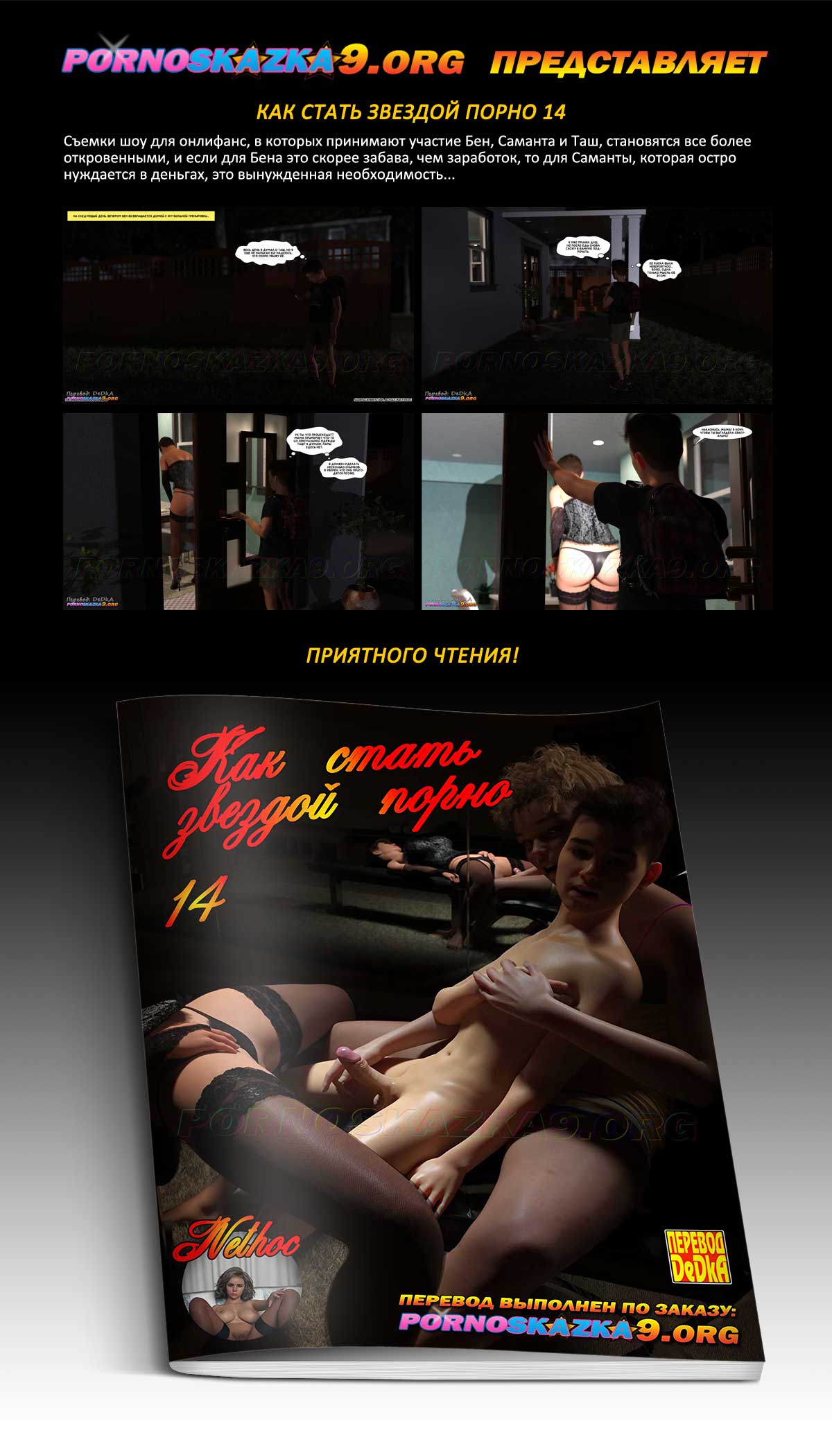 Порно комикс «Как стать звездой порно. Часть 14.» Съемки шоу для онлифанс, в которых принимают участие Бен, Саманта и Таш, становятся все более откровенными, и если для Бена это скорее забава, чем заработок, то для Саманты, которая остро нуждается в деньгах, это вынужденная необходимость…